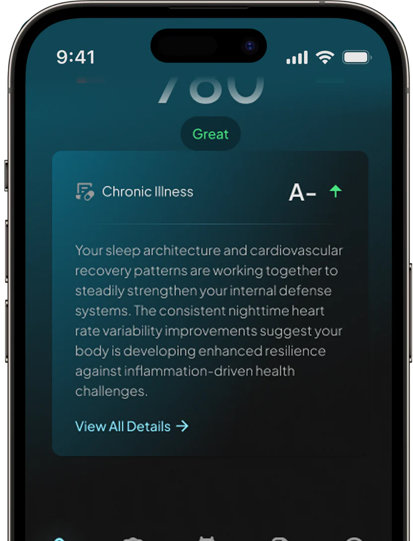 We constantly scan your biometrics to detect early signs of stress, immune decline, inflammation, and recovery delays—so you can act before illness takes hold.