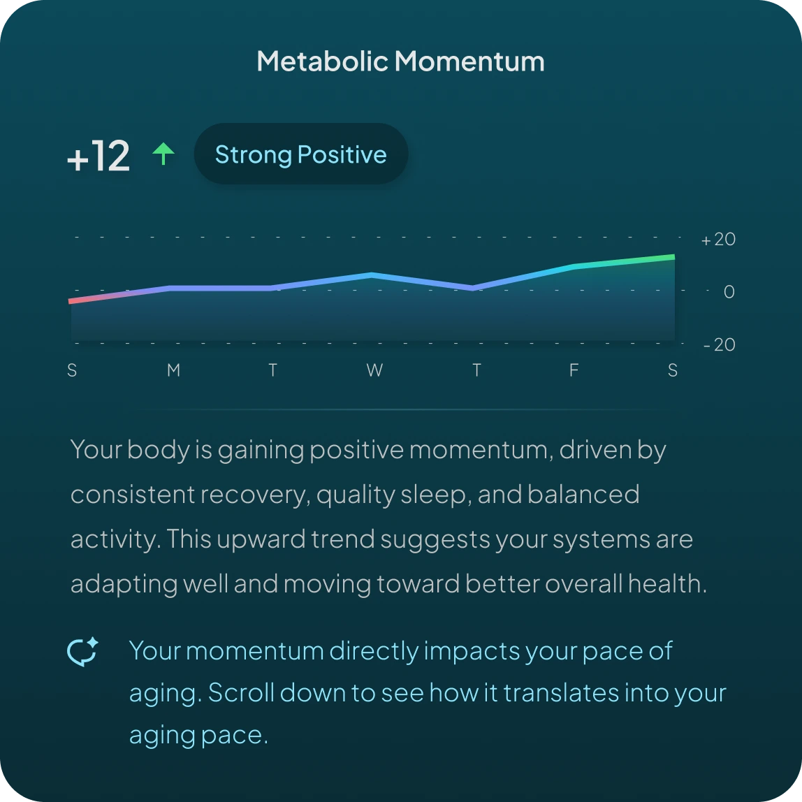 Get real-time insights into whether your daily choices are slowing aging or speeding it up. Metabolic Momentum shows you exactly where you're headed—so you can take control, adjust fast, and build a longer, stronger life.