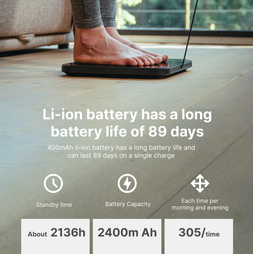 Enjoy the convenience of our smart scale with a rechargeable battery that lasts an impressive 90 days on a single charge! Need a quick boost? It charges in just 30 seconds, ensuring hassle-free tracking of your health metrics. Stay on top of your goals with a scale designed for your busy lifestyle!